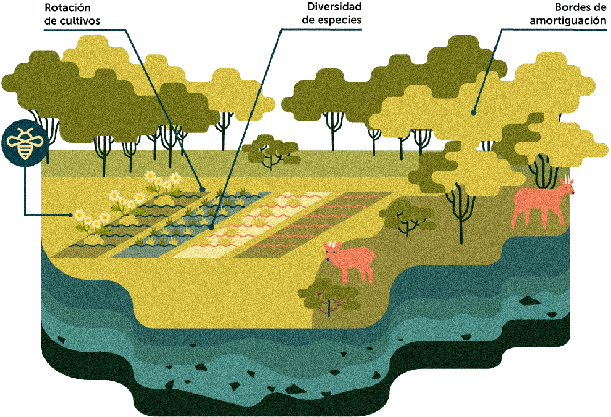 Cuando las áreas de producción agrícola colinden con áreas naturales de protección, procure incorporar sistemas de amortiguación en los cultivos, plantando áreas productivas biodiversas, abundante vegetación nativa, árboles frutales, madereros y arbustos.