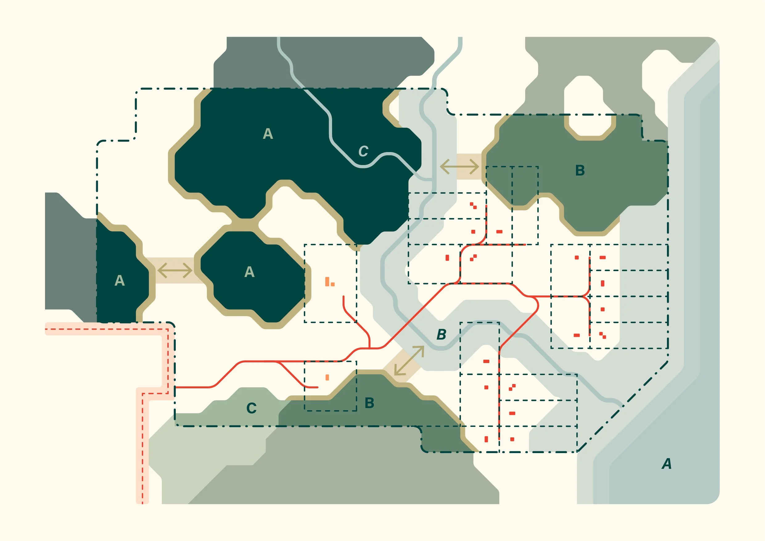 Como paso final, se trazarán las calles que conecten las distintas áreas del proyecto con el camino público. Estas implican intervenciones de alto impacto en el paisaje y, por lo tanto, se debe tener en cuenta varios criterios de diseño. Se recomienda integrar al trazado los caminos y huellas preexistentes en el terreno. A estos se articularán los nuevos caminos necesarios, buscando que sean lo más corto y eficientes posible. Para disminuir su impacto en el paisaje se recomienda evitar el trazado de c aminos lineales prefiriendo formas sinuosas y orgánicas, evitar sectores de pendientes pronunciadas que implican grandes movimientos de tierra y evitar atravesar áreas naturales protegidas.